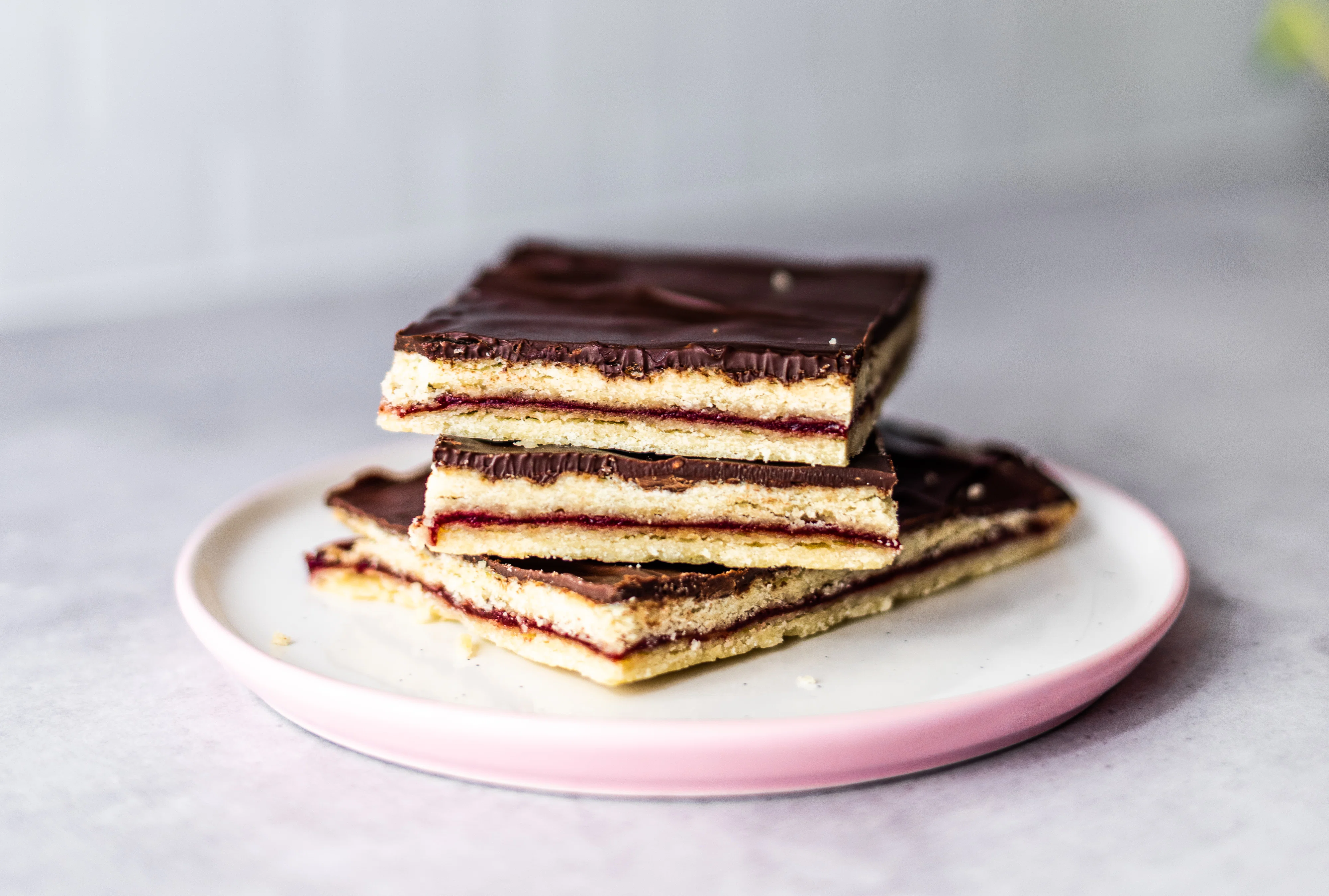 Im nächsten Schritt wird alles zusammengesetzt. Dabei müsst ihr ganz vorsichtig sein, damit keiner der Böden bricht. Jetzt fehlt nur noch die geschmolzene Schokolade und fertig sind eure Schnitten. Wenn es mal besonders schnell gehen muss, könnt ihr die Schnitten statt mit geschmolzener Schokolade auch mit veganem Schokoaufstrich bestreichen.