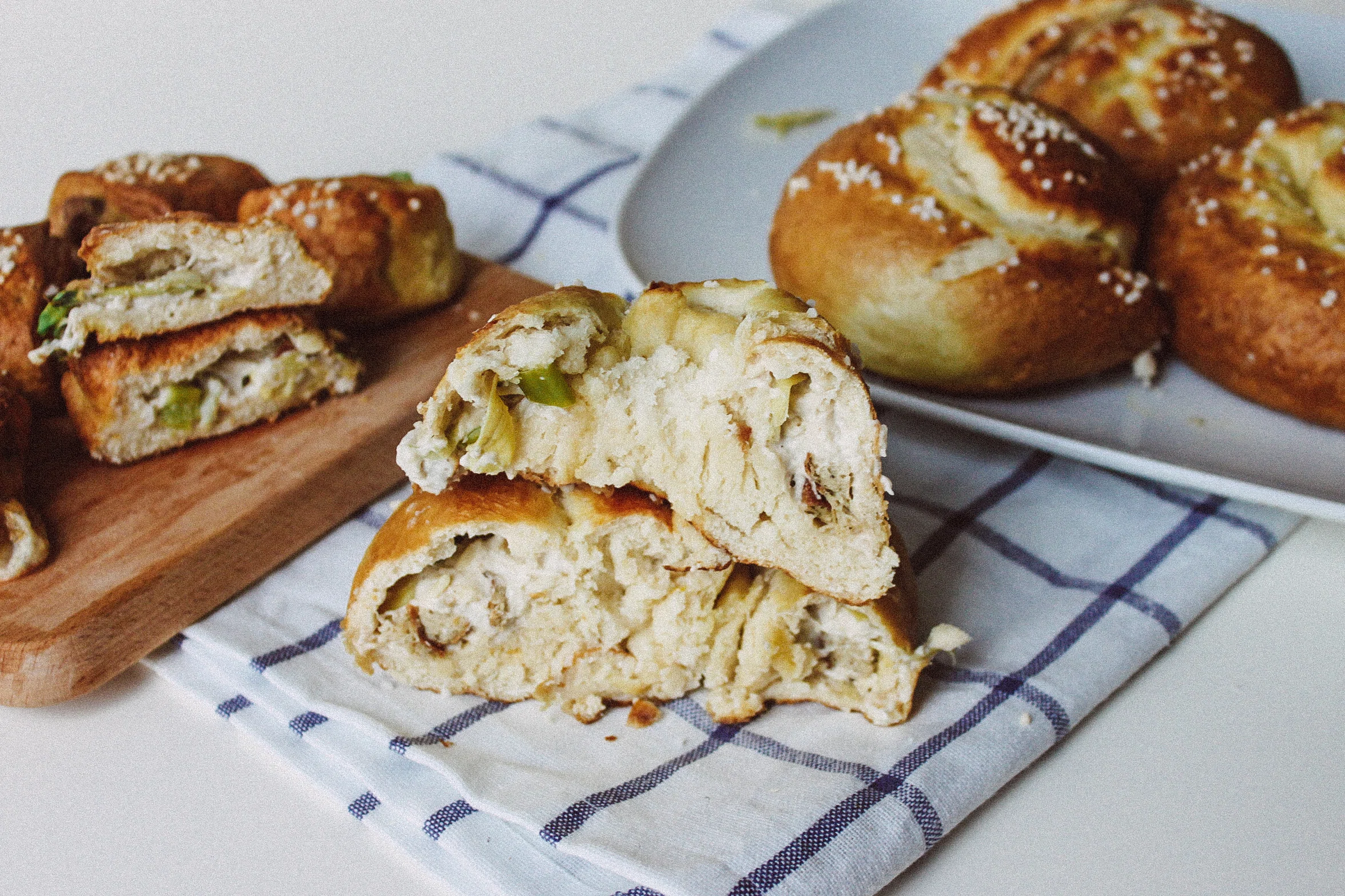 Selbstgebackene gefüllte Laugenbrötchen