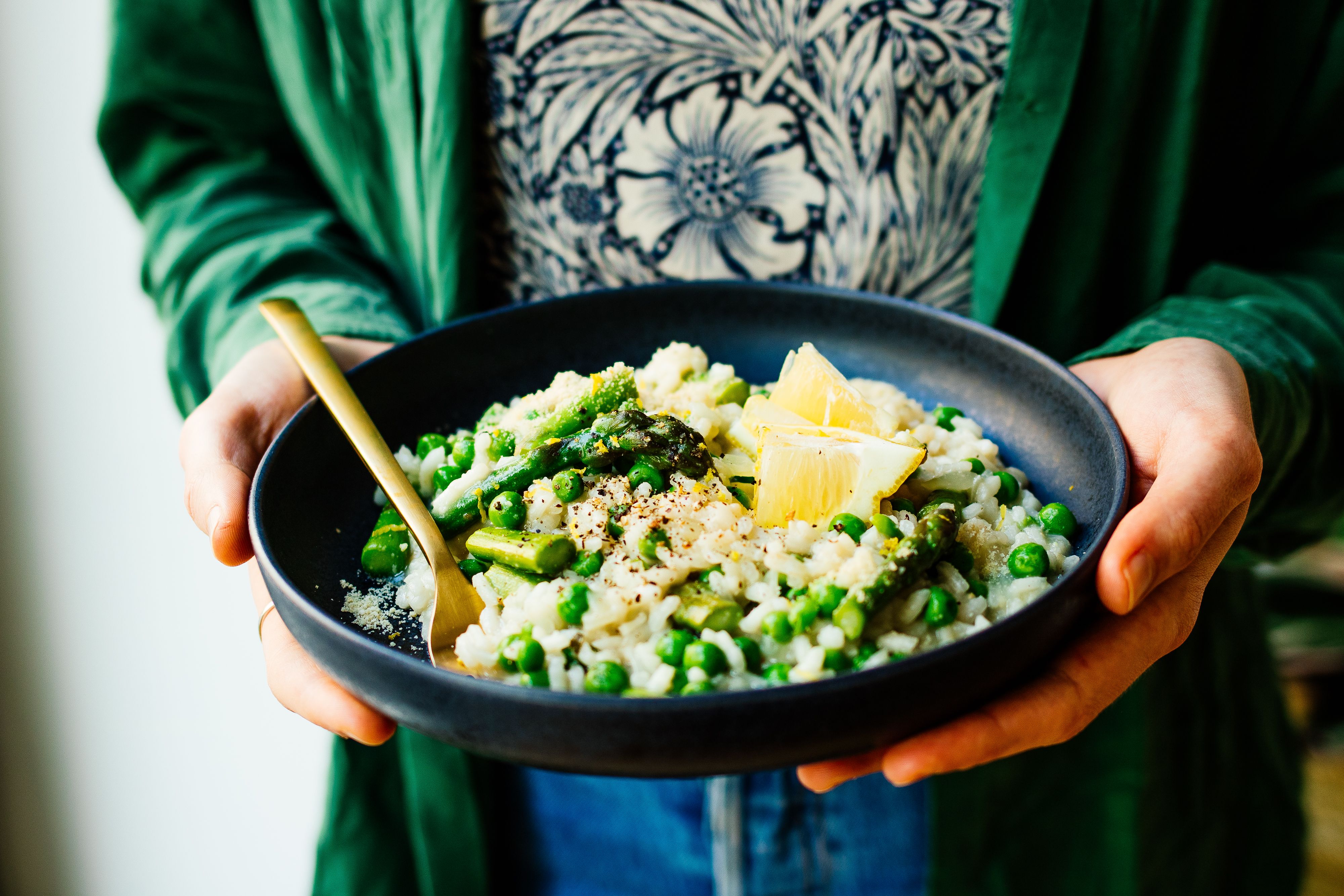 Sobald euer Risotto dann fast fertig ist, kommen noch grüner Spargel und tiefgefrorene Erbsen hinzu und schon habt ihr ein frühlingshaftes und sättigendes Abendessen auf dem Tisch! Wir können euch nur empfehlen, dazu veganen Parmesan und frischen Zitronensaft zu geben, die dem Risotto geschmacklich mehr Tiefe und einen leichten Frischkick geben. Wenn ihr jetzt in Risotto-Laune gekommen seid, dann legen wir euch natürlich auch unser Kürbisrisotto, Brokkolirisotto und Pilzrisotto ans Herz.