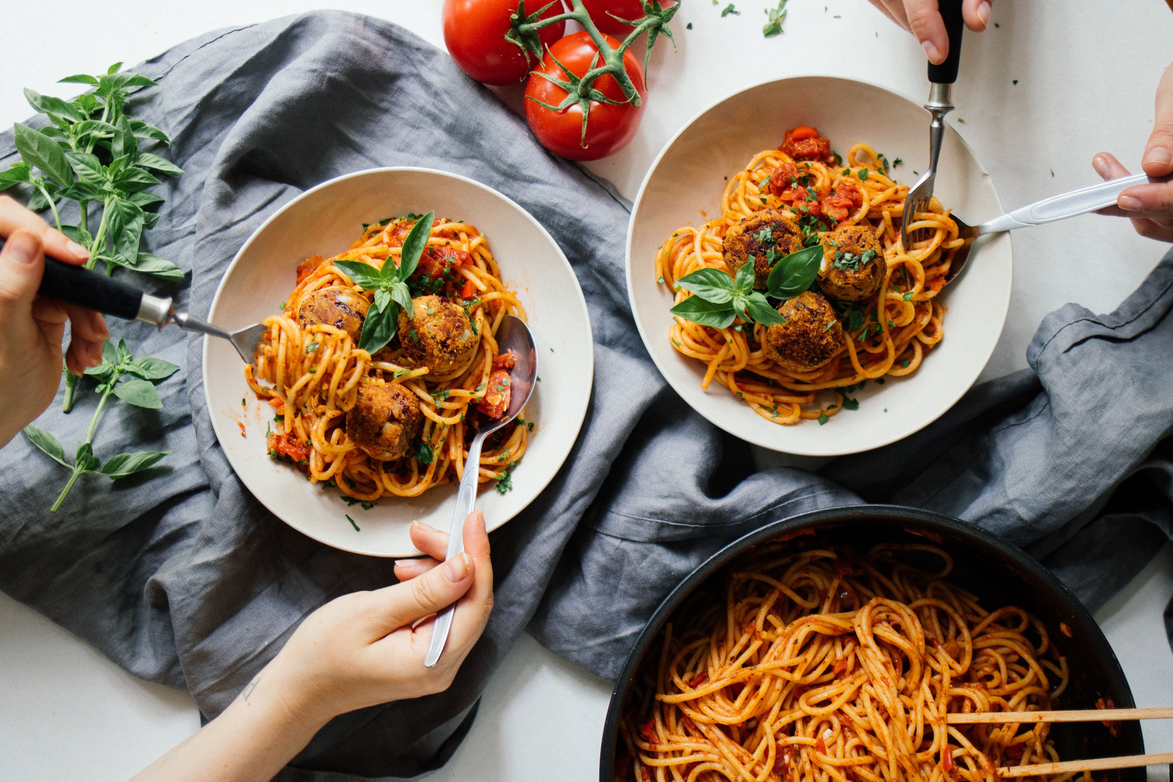 Kleine, vegane Fleischbällchen auf der Suche nach Nudeln! Unser kleines rundes Comfy-Food-Herz schlägt heute gleich zwei Mal höher, denn wir kombinieren zwei Sachen, ohne die wir verloren und für immer unglücklich wären: Nudeln & Fleischbällchen. In Italien nennt man diese Kombination „Polpetto“, das klingt dann gleich noch besser und wird mit Paprika-Tomaten-Soße übergossen. Geil, das wollen wir auch! Hier also unser unschlagbar gutes Rezept für vegane Spaghetti Polpetto aka. vegane Fleischbällchen in Paprikasoße.