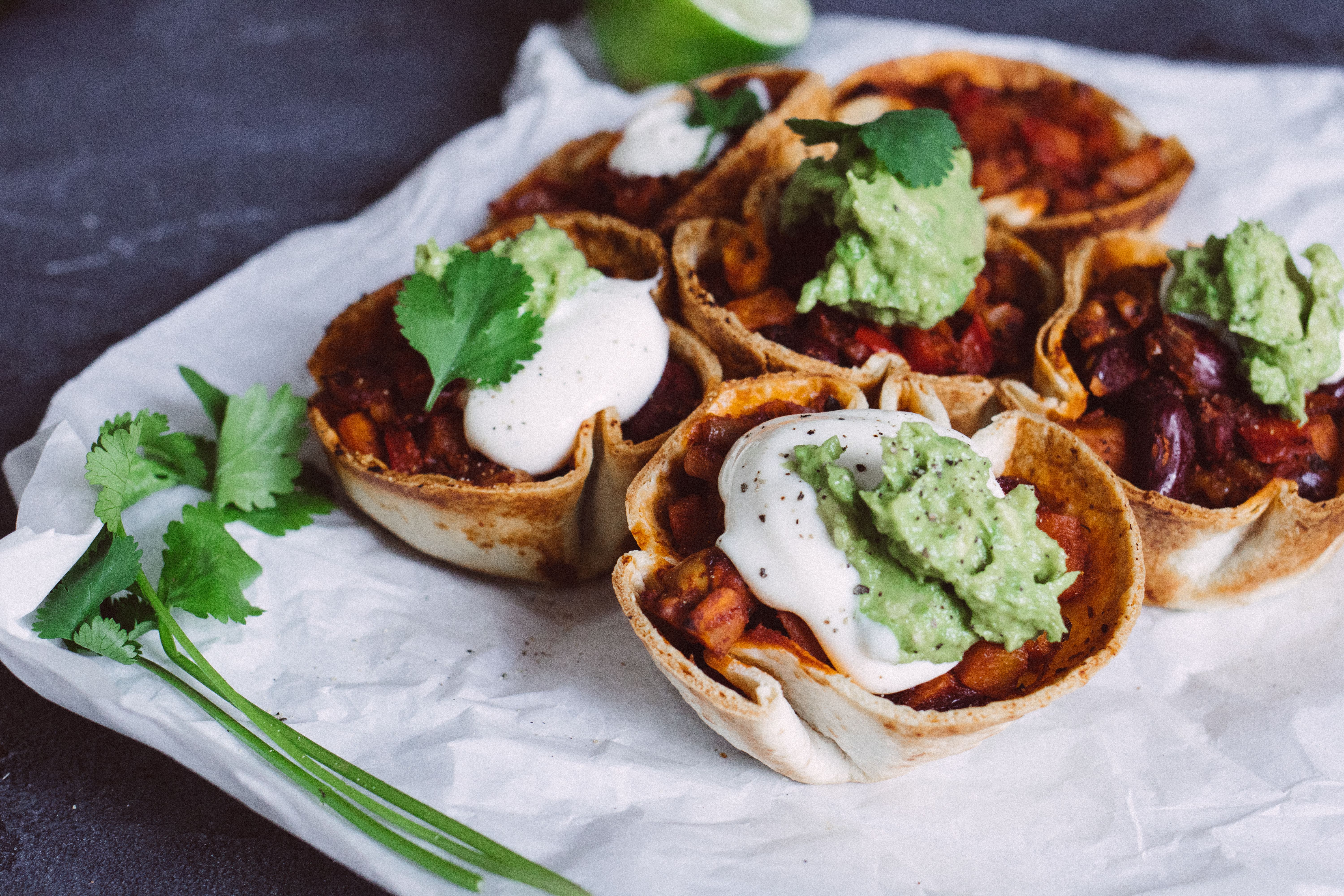 Wir füllen die kleinen Cups heute mit einem Süßkartoffel-Chili, aber natürlich könnt ihr die Füllung auch nach Geschmack abändern. So klein und handlich wie sie sind, eignen sich Taco Cups auch perfekt für ein Picknick (zum Beispiel gefüllt mit Guacamole oder Salätchen), als Partysnack oder zum Brunch. Schreibt uns gern in die Kommentare, womit ihr eure Taco Cups füllen wollt, wir sind gespannt!