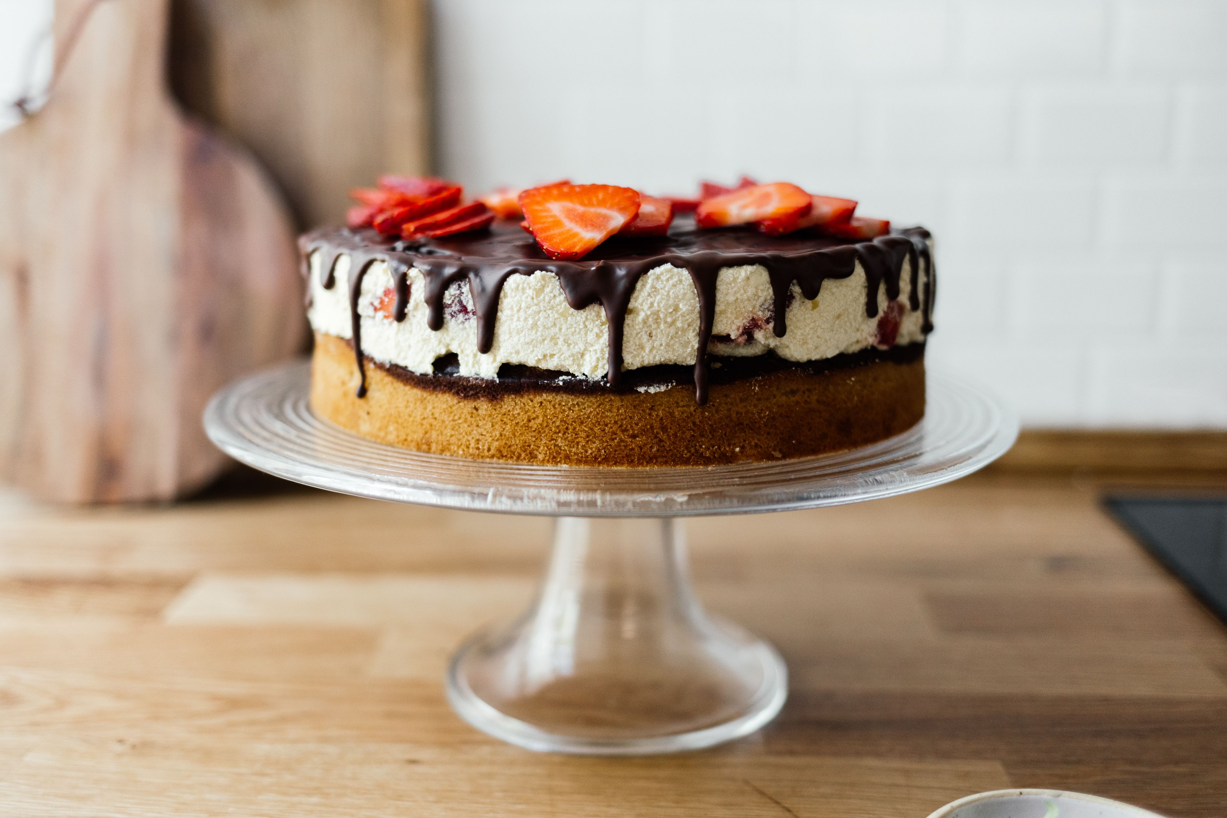 Für die Schokoladenschicht die Zartbitterschokolade in einem Wasserbad erhitzen und das Kokosöl unterrühren. Die Schokolade auf Raumtemperatur abkühlen lassen und gleichmäßig auf dem Kuchen verteilen. Nun direkt mit den Erdbeerscheiben dekorieren und für mindestens 1 Stunde kaltstellen.