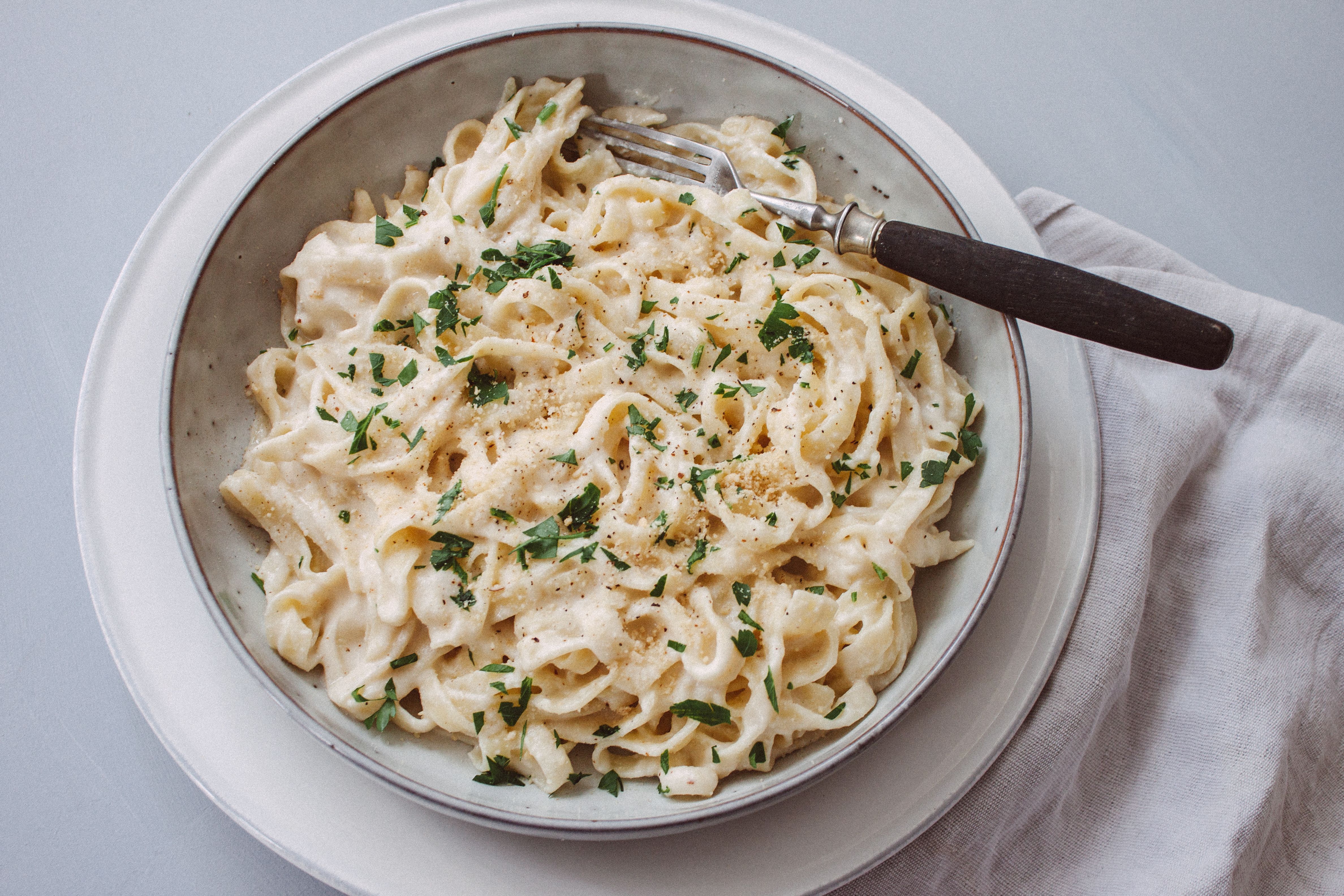 - Gießt die Fettuccine ab und gebt sie zusammen mit der Soße in eine Pfanne über mittlerer Hitze. Schwenkt das ganze gut durch und gebt dabei nach und nach Kochwasser hinzu, bis die Soße abgebunden und wunderbar cremig ist. Nun noch die vegane Butter unterschwenken und nach Geschmack nochmal mit Salz und Pfeffer würzen. Serviert die Fettuccine mit Petersilie, veganem Parmesan und frischem Pfeffer oder auch ein paar Chiliflocken!