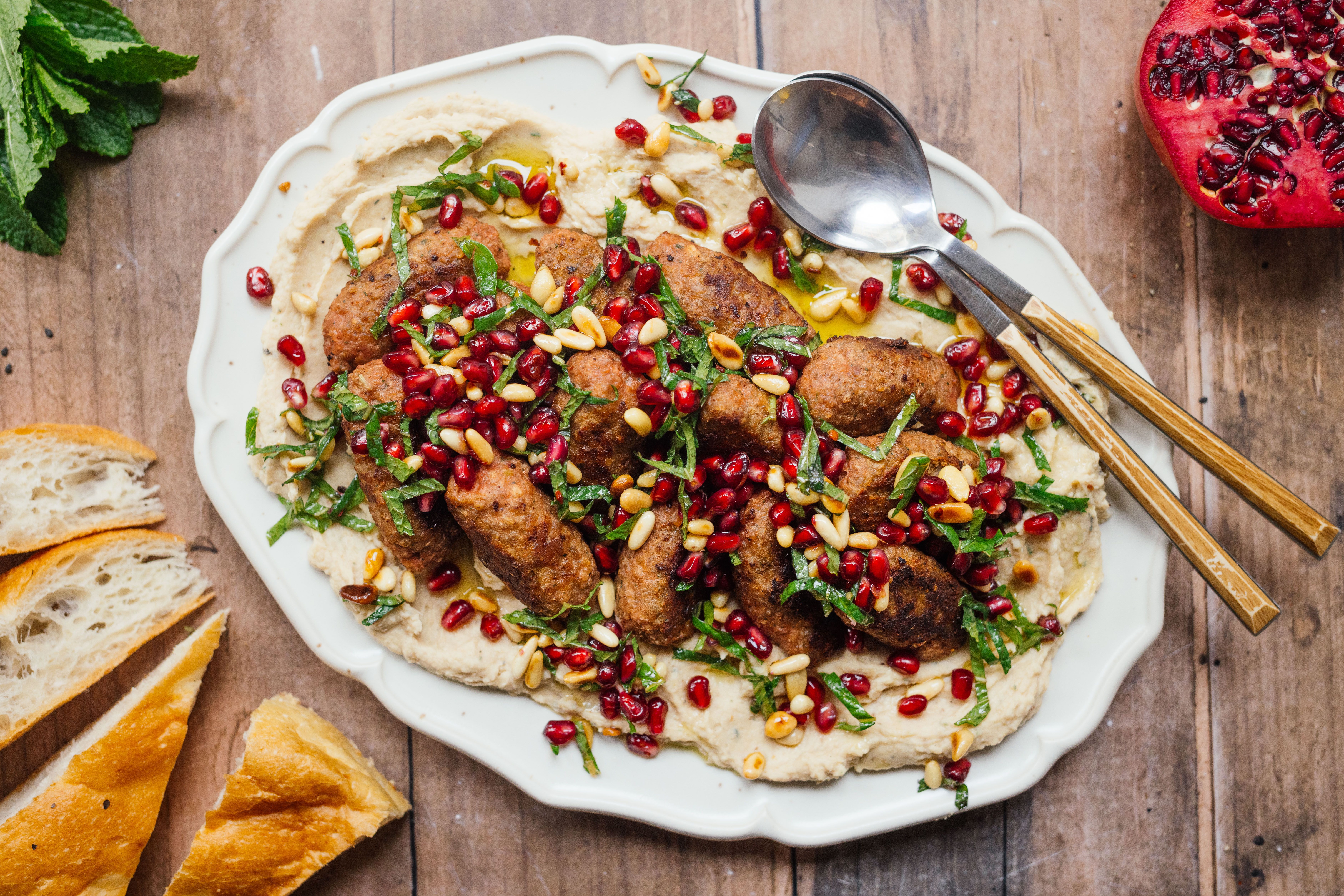 Das Bohnenpüree auf einer großen Platte verstreichen. Die veganen Köfte darauf platzieren und mit dem Granatapfel-Pinienkernen-Topping dekorieren. Etwas Olivenöl drüber drizzeln.
