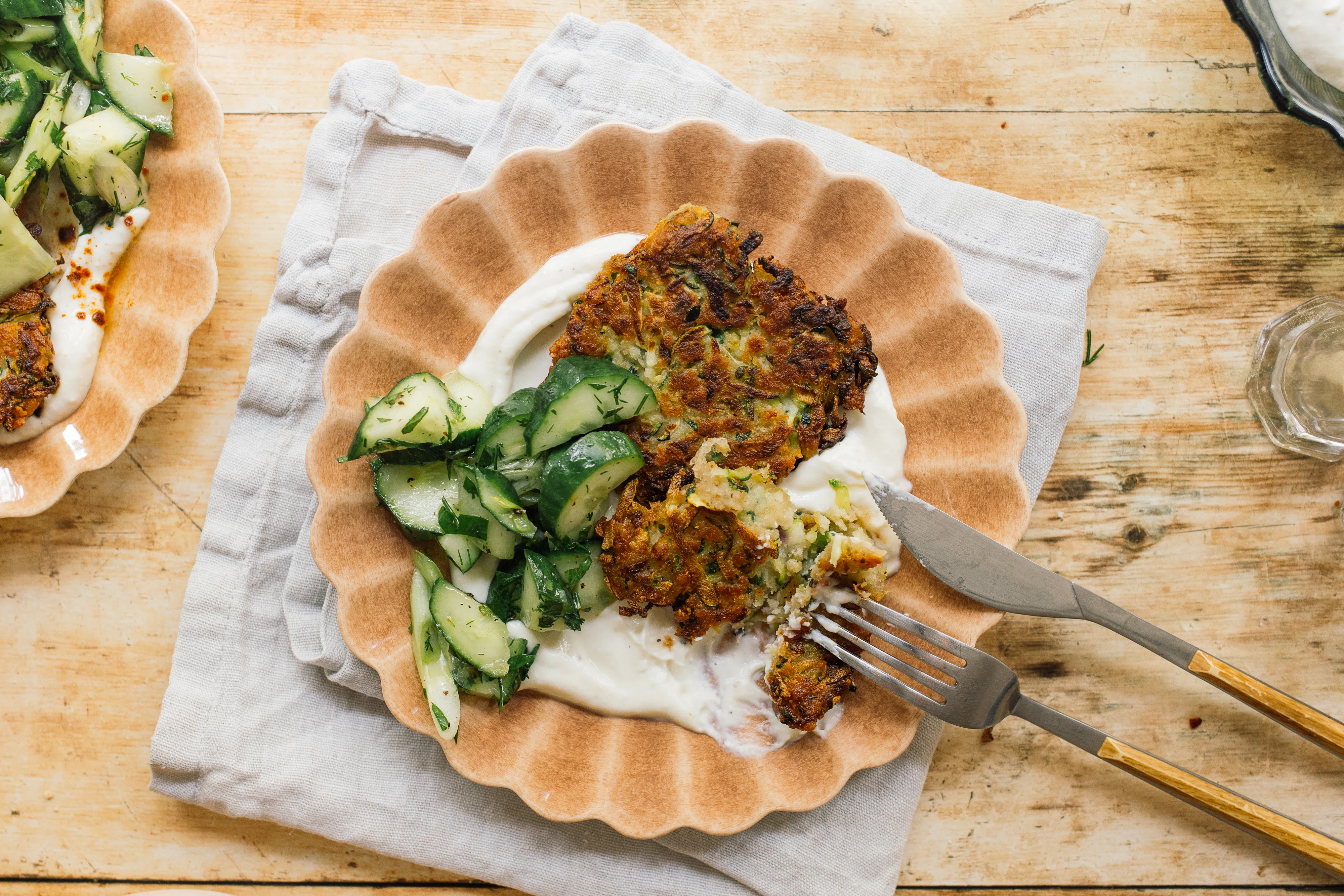 Doch wie kommt es, dass ich Zucchini in diesem Rezept plötzlich doch gut finde? Tja, über die Zeit habe ich das Rezept immer weiter angepasst, bis es knusprig, salzig, sauer, frisch und wunderbar würzig wurde. Also eigentlich all das, was ich überhaupt nicht mit Zucchini verbinde. Ich reibe sie fein und drücke sie aus, damit die Puffer möglichst knusprig werden. Auch Reismehl ist hier eng an meiner Seite, denn es sorgt für noch mehr Knusprigkeit. Paniermehl hingehen bringt einen deftigen Geschmack mit in die Puffer, genauso wie die Zwiebeln. Am Ende frittiere ich die Puffer fast, damit man den Crunch auch noch im Nachbarhaus hört. Dazu gibt einen salzigen und fluffigen Whipped Feta Dip und einen frischen und sauren Gurkensalat.