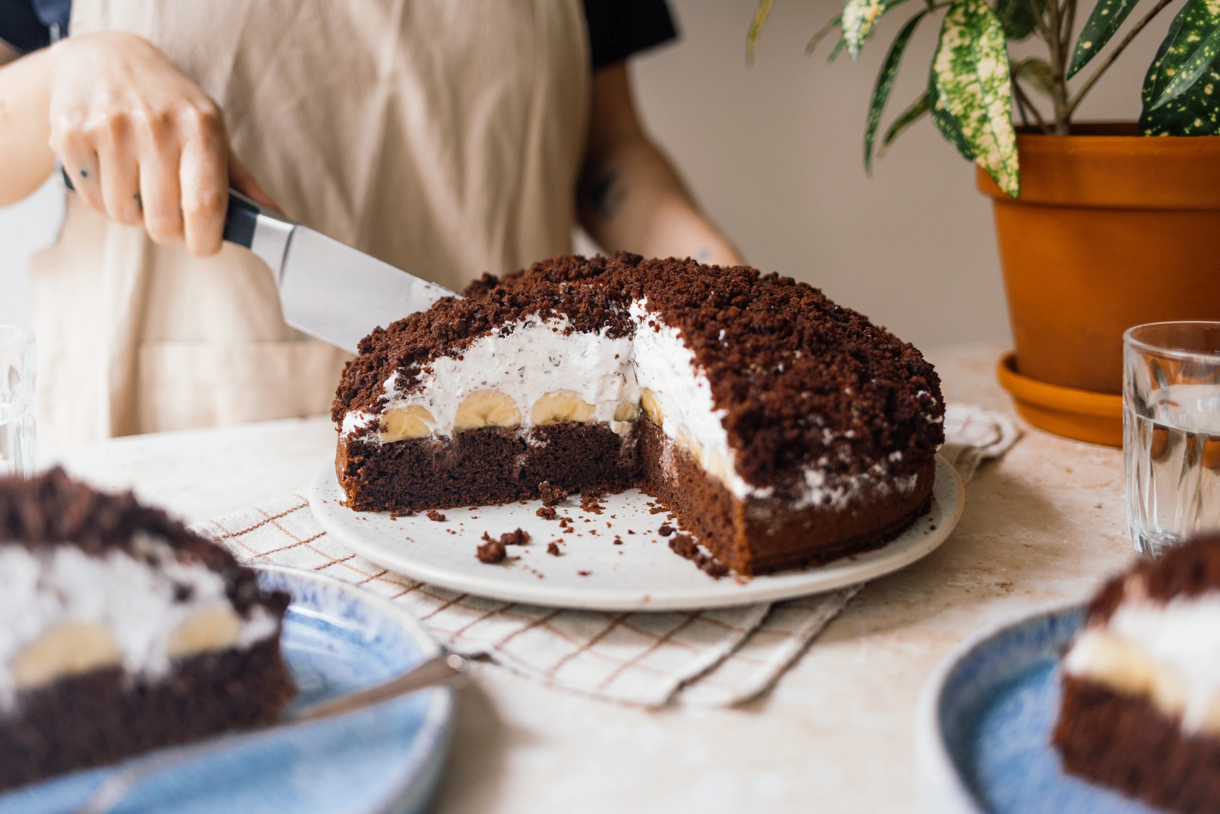 Und auch die Zutaten sind übersichtlich. Es gibt also wirklich keinen Grund, bei diesem Kuchen auf eine Backmischung zurückzugreifen – auch, wenn wir Maulwurfkuchen wahrscheinlich alle vor allem durch diese eine bekannte Backmischung kennengelernt haben. Wenn ihr gerne schon einen Teil vorbereiten wollt, dann empfehle ich, den Teig und die Sahne schon am Tag davor zuzubereiten, sodass ihr am nächsten Tag nur noch anrichtet. Aber auch schon fertig zubereitet hält sich euer Maulwurfkuchen 3–4 Tage im Kühlschrank. Achtet beim Einkauf unbedingt darauf, dass ihr eine vegane Sahne zum Aufschlagen findet (keine Kochsahne!), dann steht eurem Bananen … äh, Maulwurfkuchen nichts mehr im Wege!
