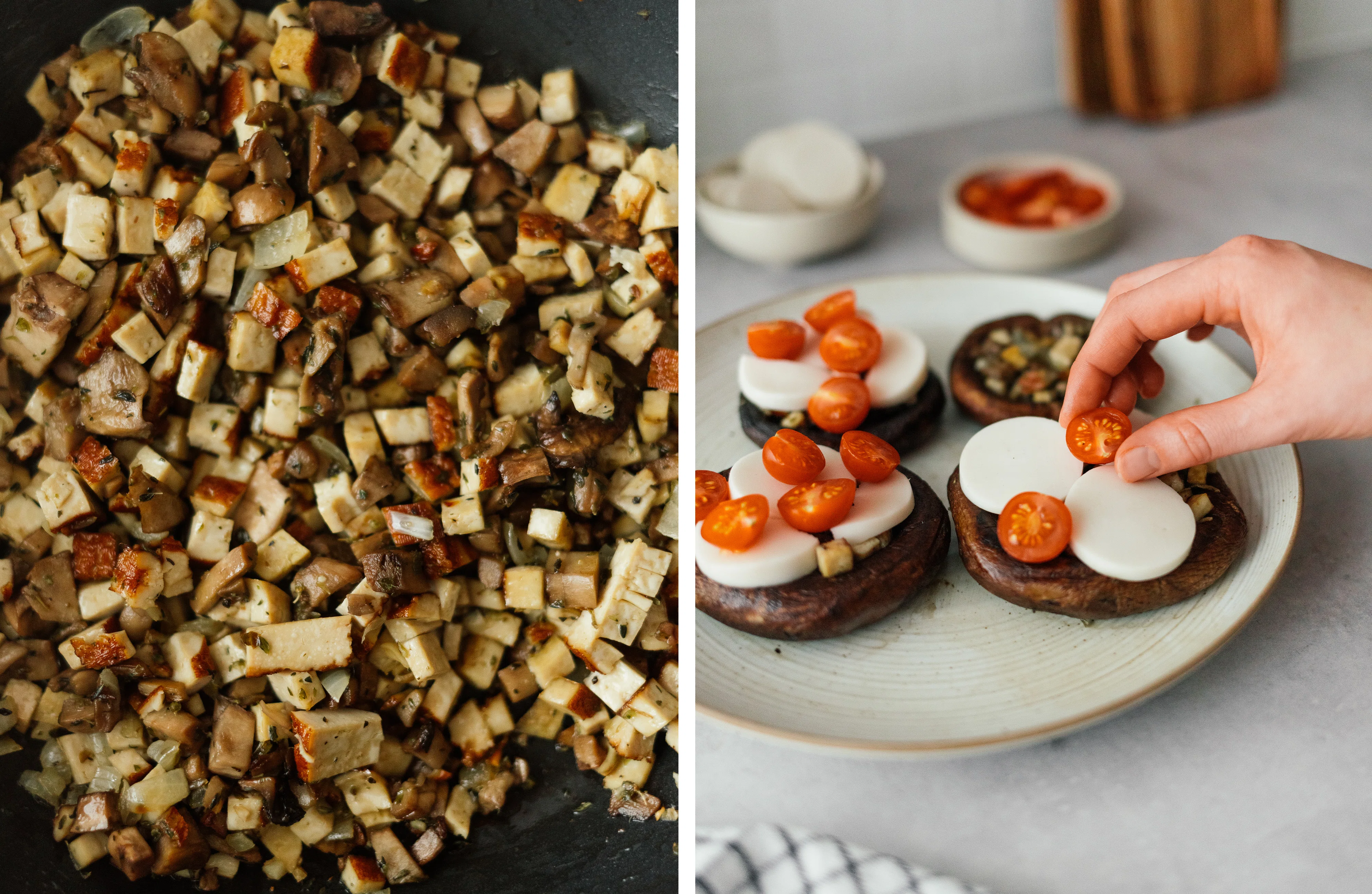 Preheat the oven to 180°C/355°F (top/bottom heat) or prepare the grill. Once the mushrooms are cooked and the tofu is crispy, remove the mushrooms from the pan, drizzle with some apple balsamic, and fill with the tofu mixture. Then top each mushroom with vegan mozzarella and tomatoes. Bake the mushrooms for about 20 minutes or broil them on the grill until the vegan mozzarella is slightly melted and the tomatoes are softened.
