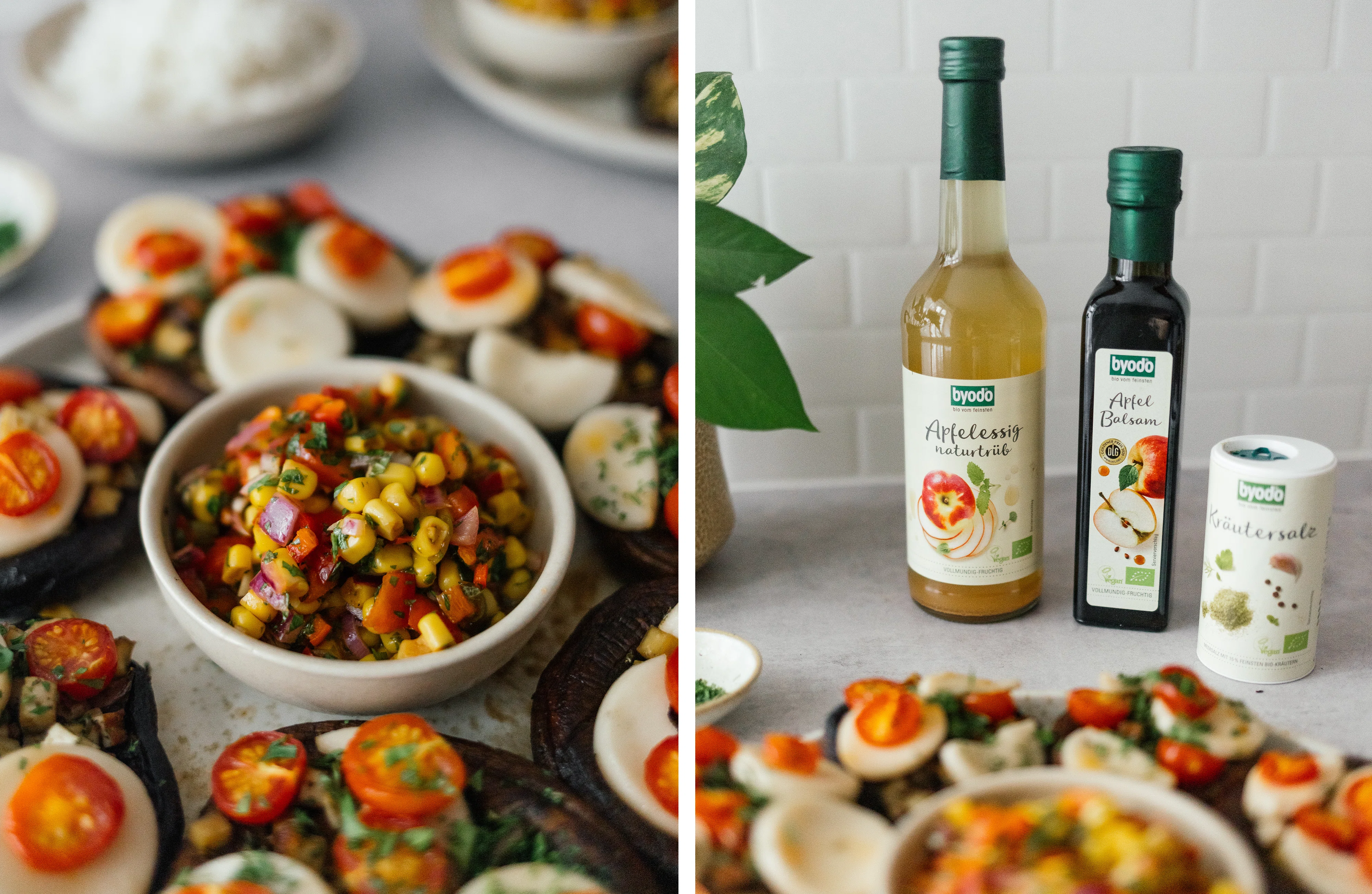For the salsa, we opted for a refreshing combination of bell peppers, sweet corn, onions, garlic, hot chili peppers, and fresh herbs. We mixed the veggies with some oil, maple syrup, and the apple cider vinegar and apple balsamic vinegar from Byodo.Apple balsamic vinegar adds a great fruity apple note and apple cider vinegar adds a refreshing acidity to the salsa. Byodo's classic kinds of vinegar all have an acidity of 5-6%, which is also perfect for pickling vegetables. Plus, all types of vinegar are vegan and made from 100% organic ingredients.