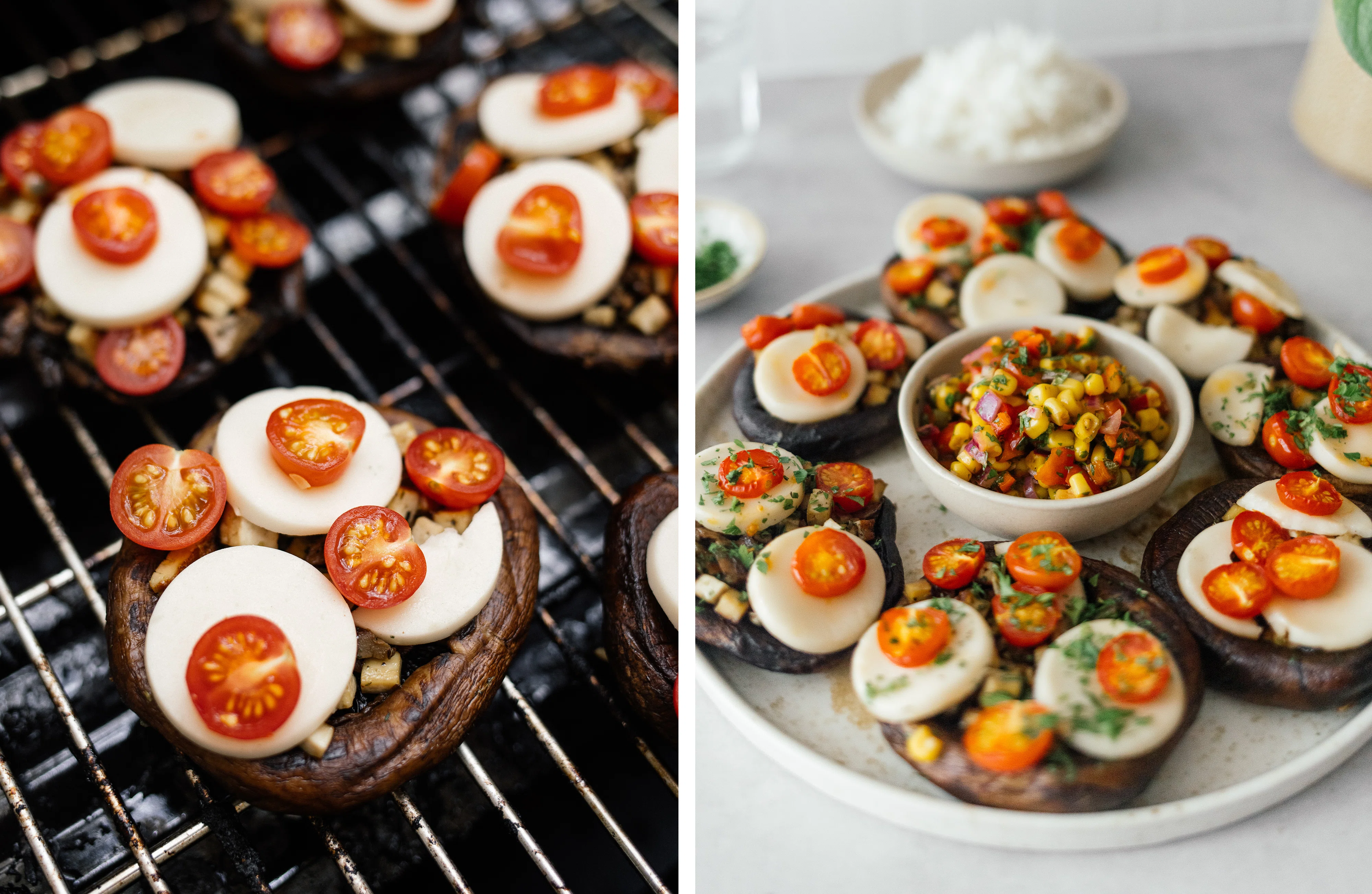 In keeping with the spirit of summer and the barbecue season, however, today is all about grilled mushrooms. More specifically, we stuffed portobello mushrooms and then grilled them. Portobello mushrooms are basically button mushrooms that have grown very large. They have a firmer texture and a slightly stronger flavor than regular button mushrooms, and their size makes them perfect to stuff and grill. Among other things, we filled them with smoked tofu and topped them with vegan mozzarella. In addition, we served them with rice and a delicious homemade salsa. Simply wonderful!