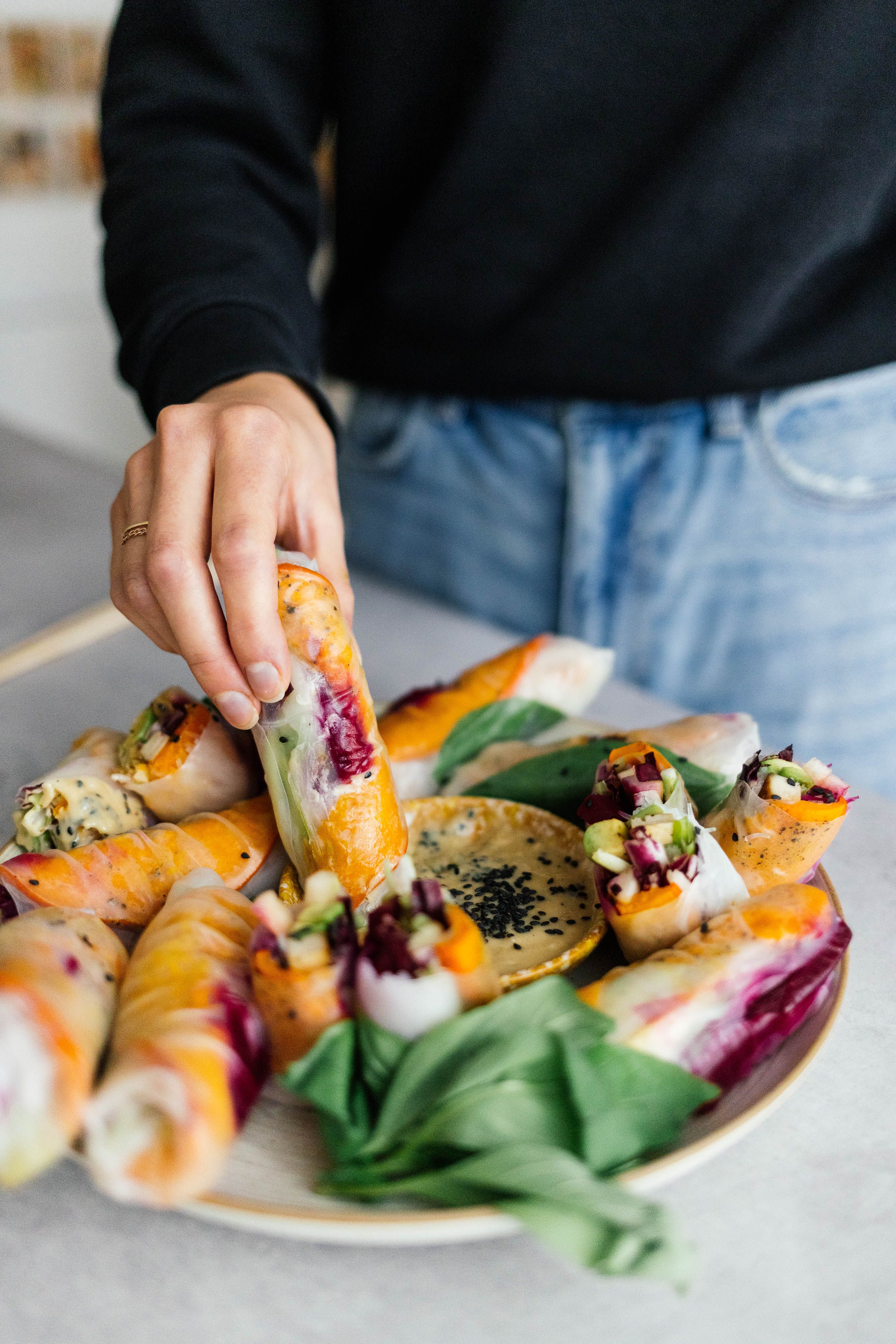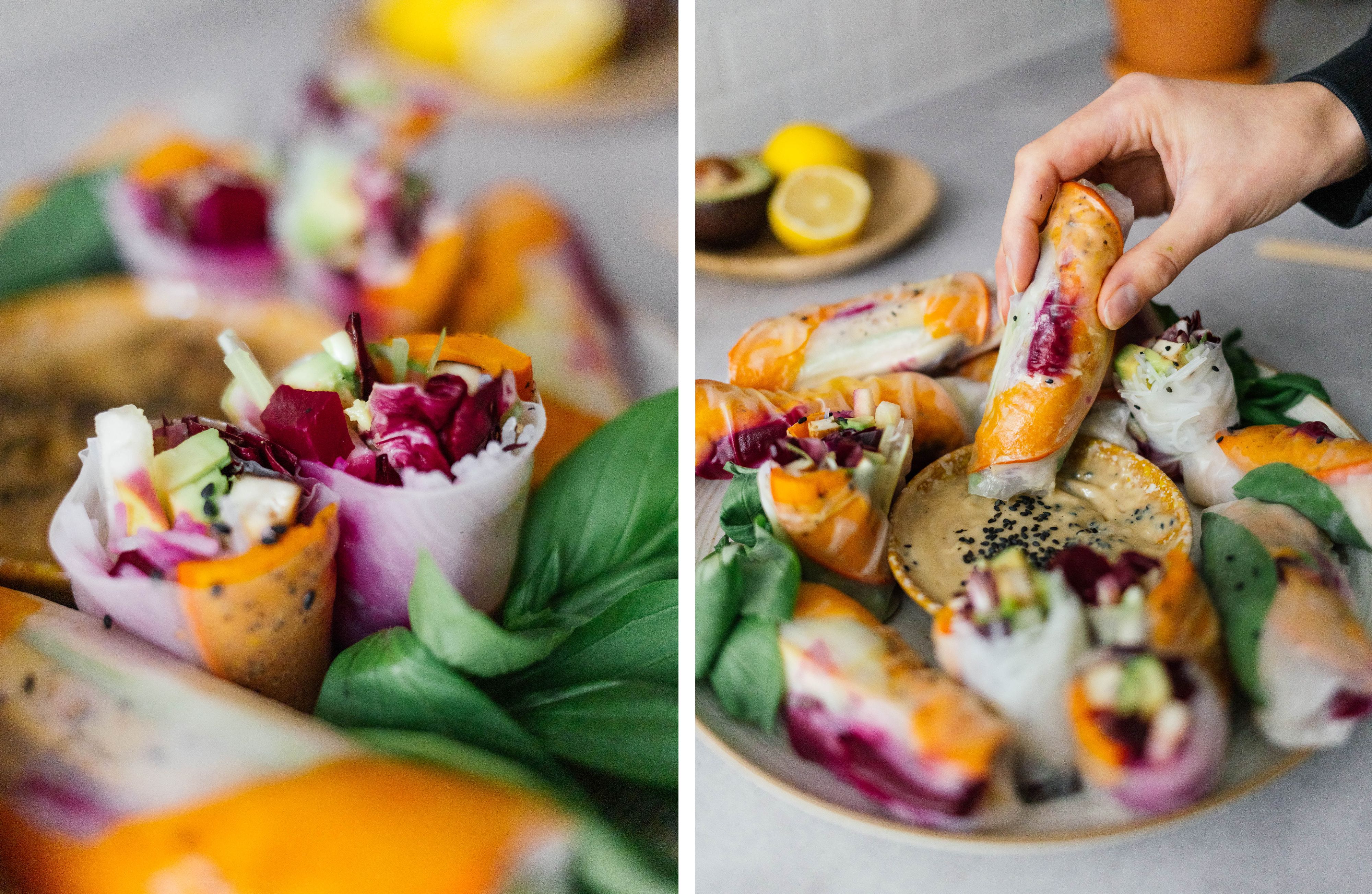 Probably the most complicated part of this recipe is the rolling of the rice paper. If you've ever made summer rolls, you know what I'm talking about. First, place the filling as you like in the center of the moistened rice paper. It’s essential not to use too much at once. Now, fold the bottom part of the rice paper over the filling. Then fold in the right and left sides as well and roll everything up tightly. Don't worry, practice makes perfect! To top it all off, we use a hearty, nutty sesame dip by mixing tahini, agave syrup, garlic, and olive oil and season everything with pepper and salt. The autumn rolls are great to prepare and will keep in the fridge for up to two days. It’s a perfect snack or great finger food for any party!