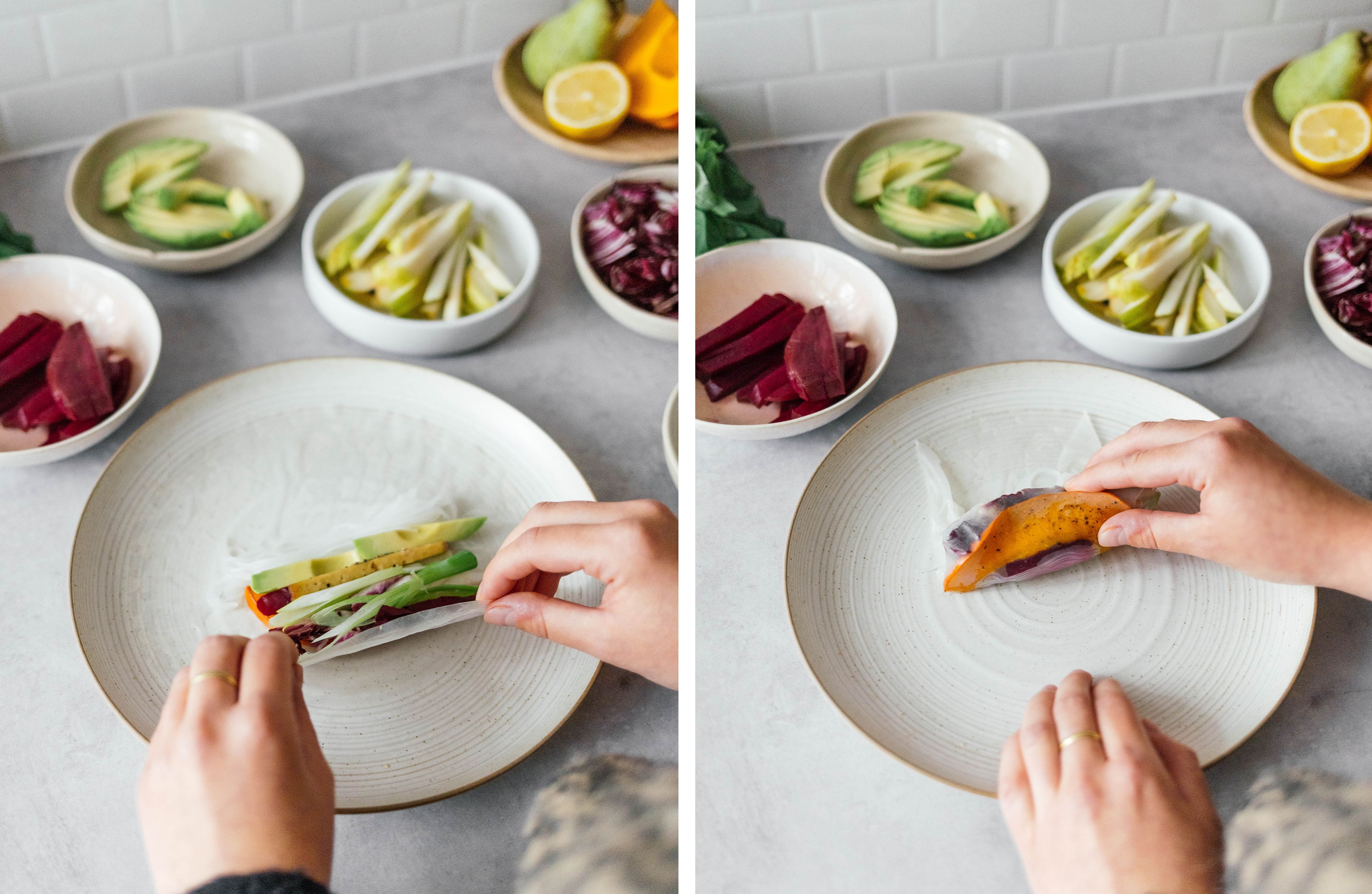 Prepare a large bowl with warm water. Place the rice paper in it and wait a few seconds until it’s soft enough to roll. Then put the rice paper on a large plate. Place rice noodles, pumpkin, tofu, pear, scallions, avocado, beetroot, radicchio, and Thai basil in the center and fold the bottom of the rice paper over the filling. Fold in the right and left sides and roll up tightly.