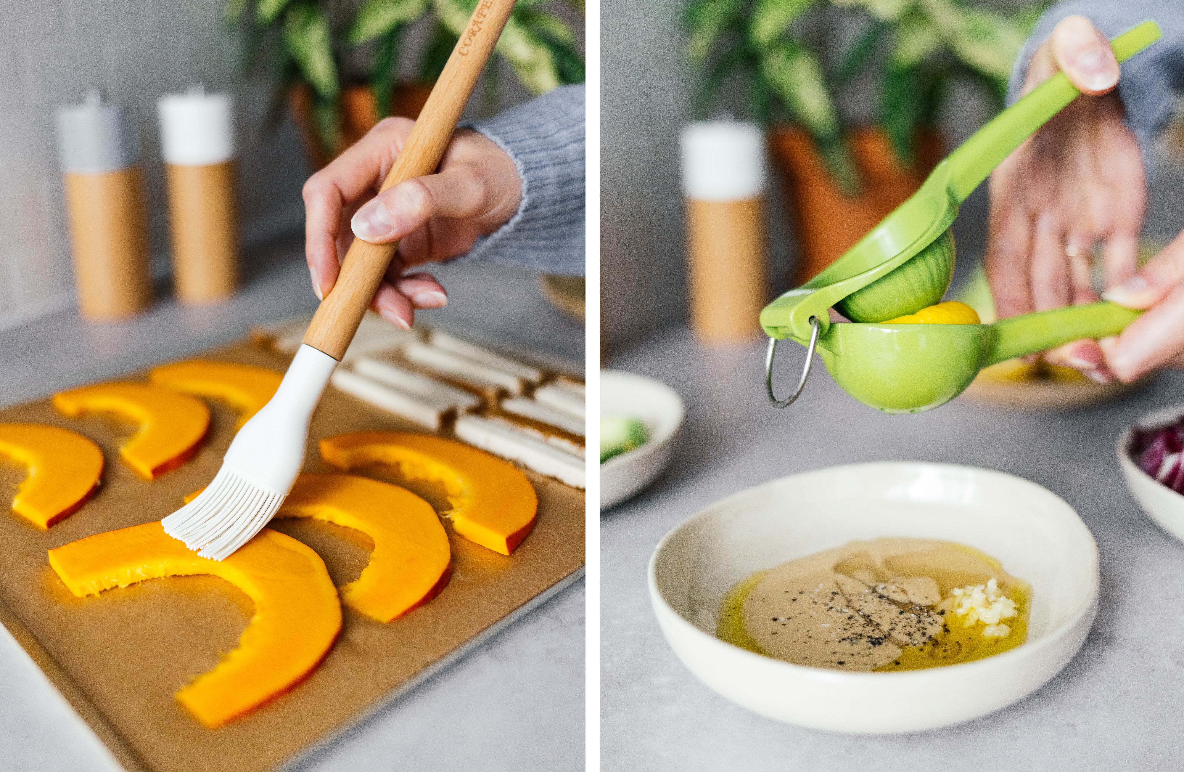 What can't be missing in a proper autumn roll? The pumpkin, of course! In our case it’s hokkaido, but you can use any other pumpkin you like. But make sure that the peel of the respective pumpkin variety is edible, or remove if necessary. Our pumpkin is joined by crispy smoked tofu, which we cut into fine strips, brush with a bit of oil and bake for a few minutes. Meanwhile, we chop our remaining ingredients: crisp, sweet pear, slightly bitter radicchio, beetroot, and creamy avocado.