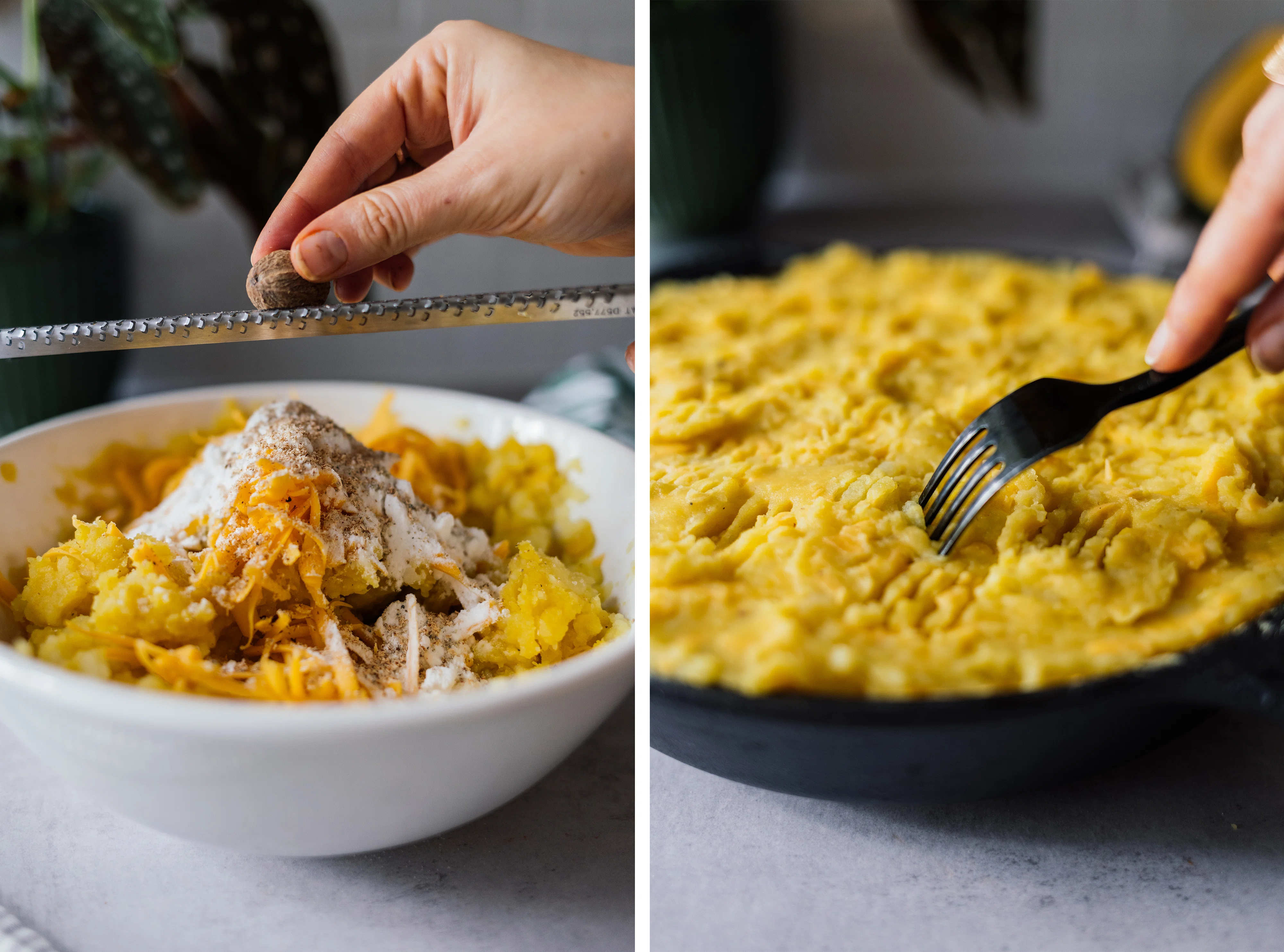 Coarsely mash the potatoes and the squash. Add vegan butter, grated vegan cheddar cheese, and potato flour and mix them together. The mashed potatoes should not be as creamy as usual. Finally, season with salt, pepper, and nutmeg.