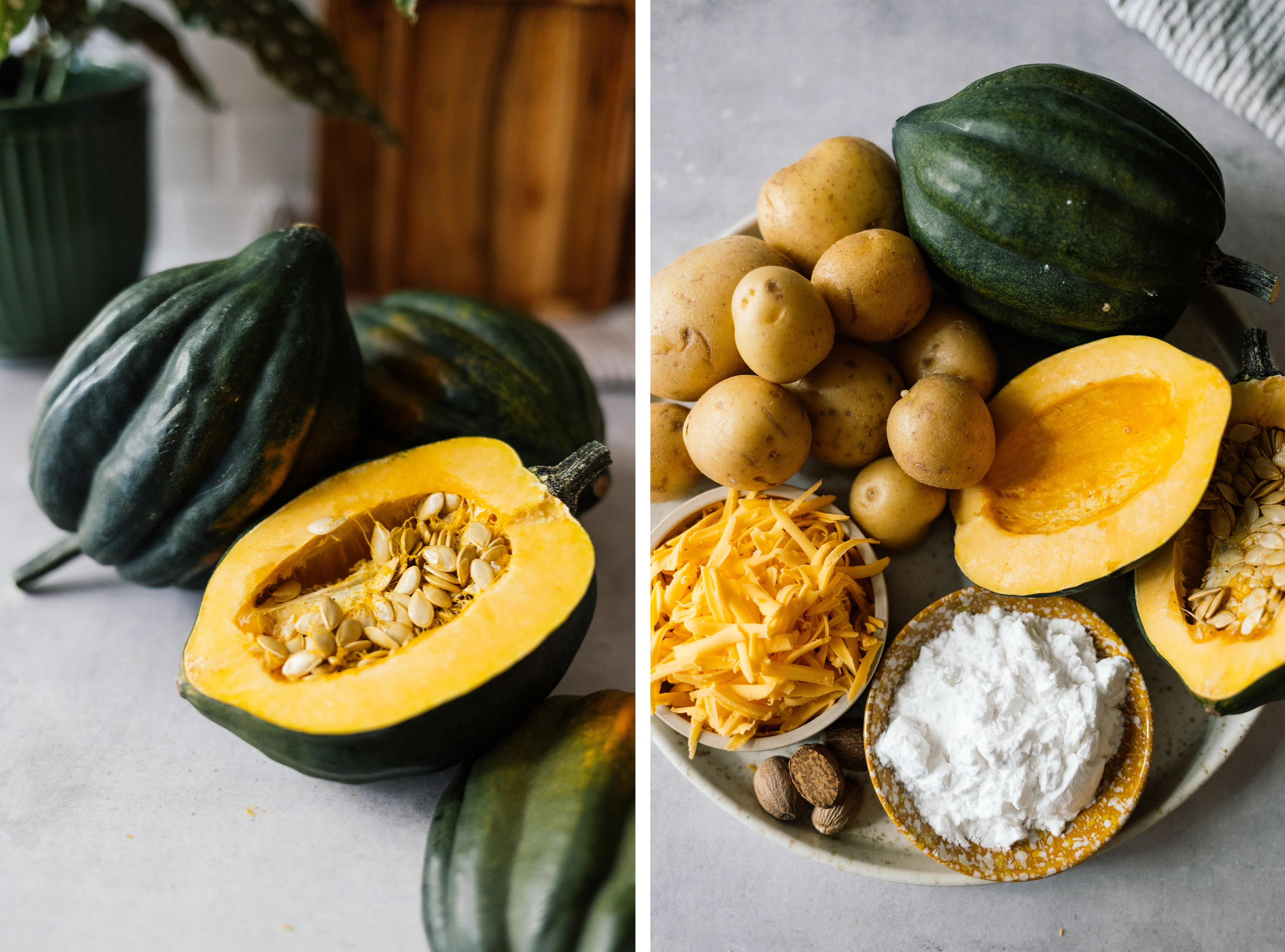 Cut off the ends of the acorn squash, cut the squash in half, remove the seeds and peel. Cut the flesh into coarse pieces. Peel the potatoes and cut them in half if they are too large.