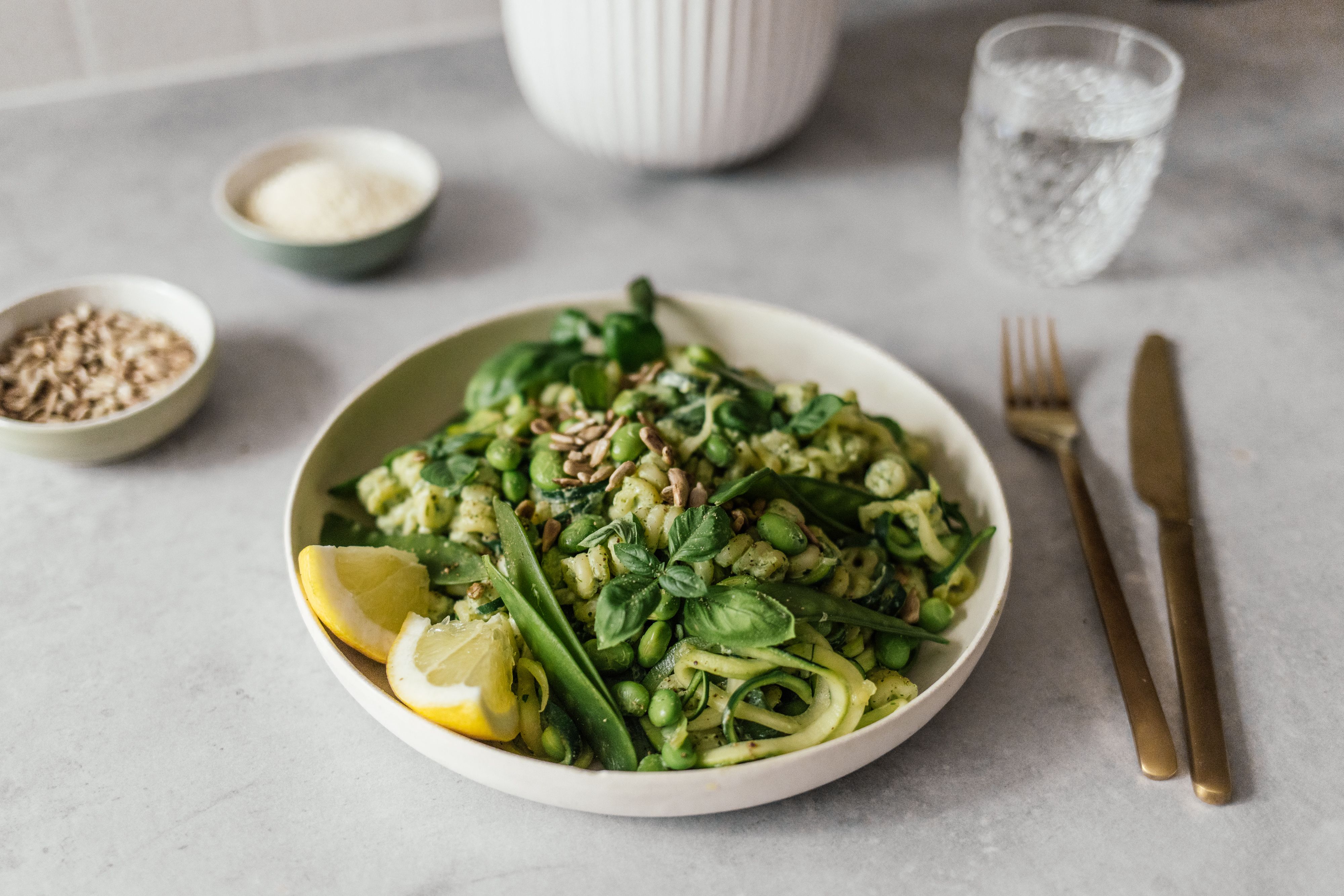 Once the pasta is cooked, add the green sauce and the vegetables to the pasta and mix well. Serve with toasted sunflower seeds, fresh herbs, and vegan parmesan cheese.