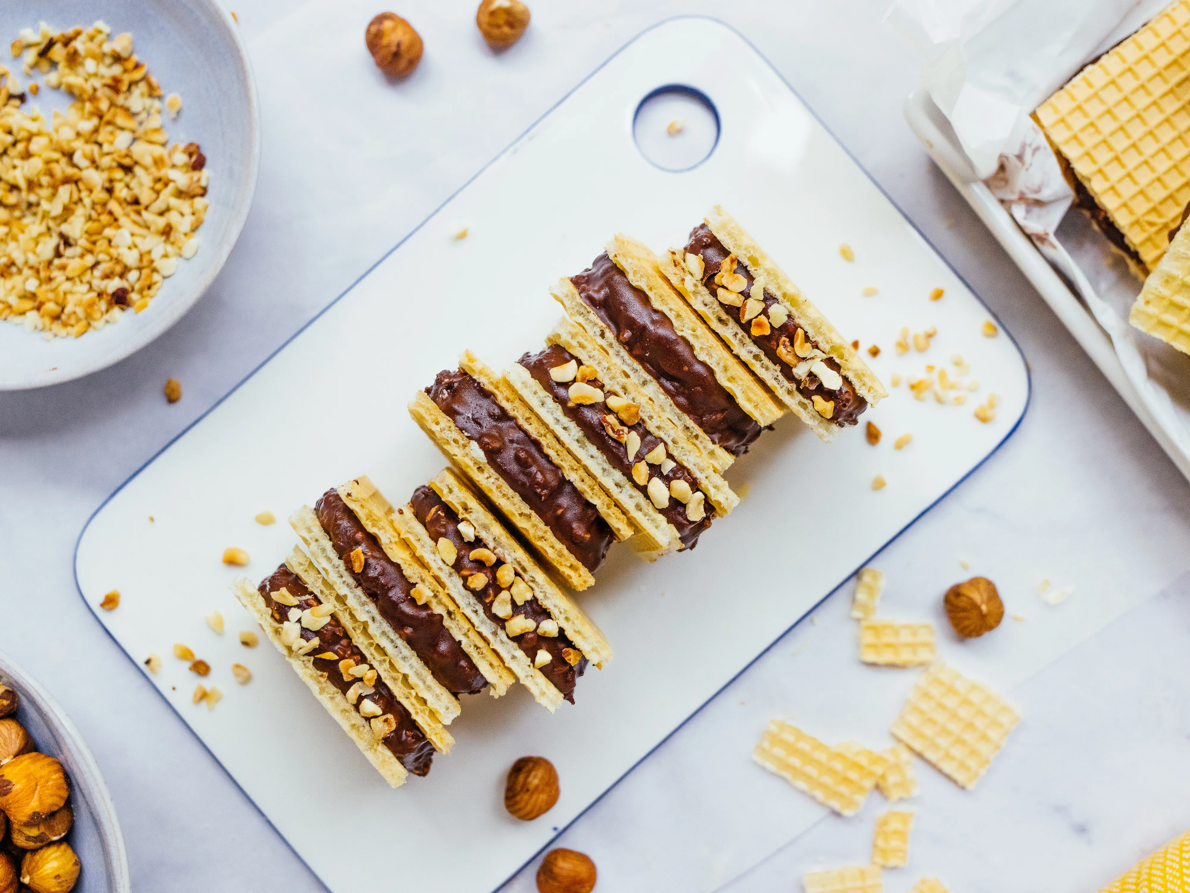 - Spread approx. 2 - 3 tsp. of the chocolate-hazelnut mass on one wafer base and place a second wafer square on top. Continue in this way until the mixture is completely used up.