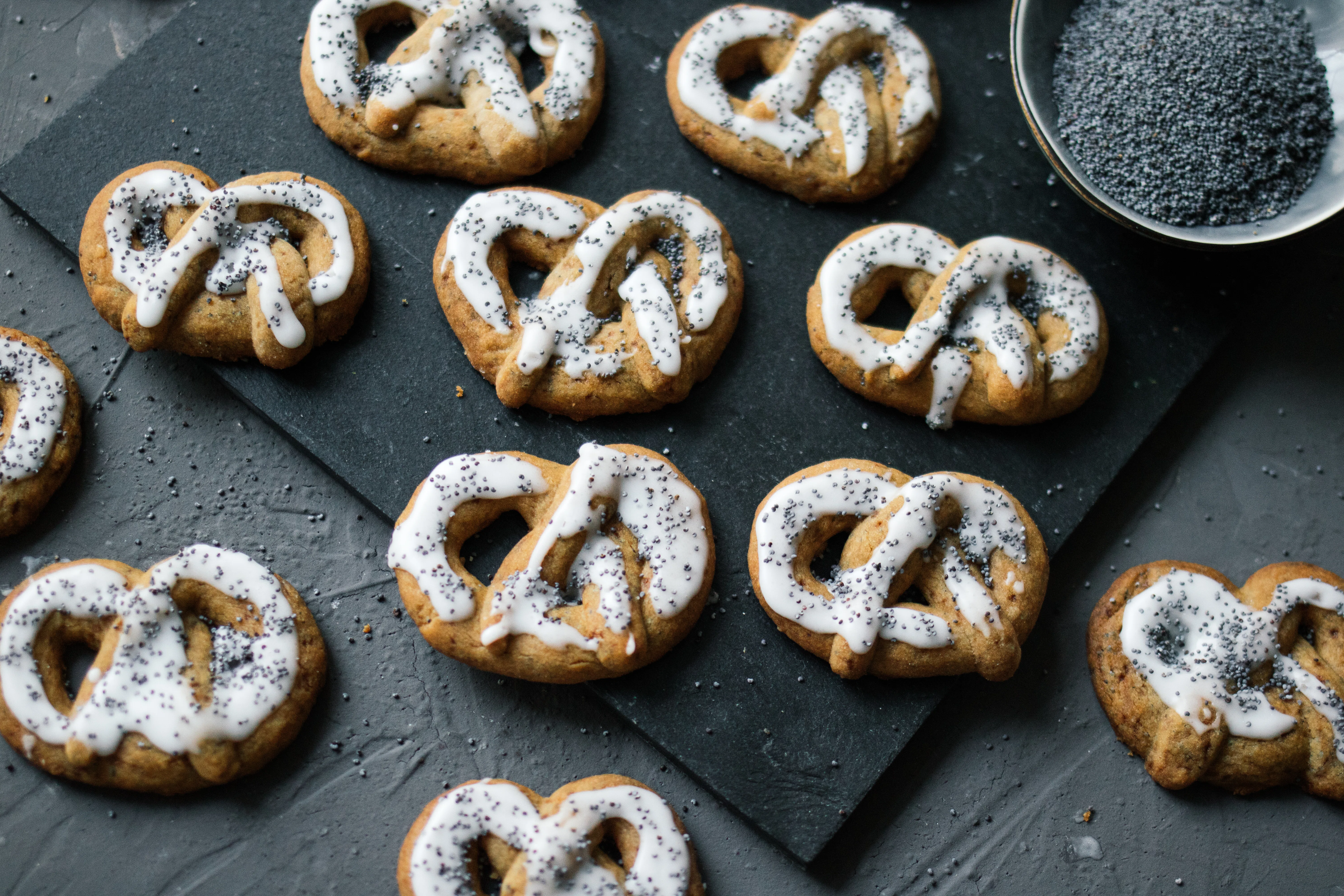 Now, let's get to the ingredients! Let's do as our pretzel baker does and form lots of little hugs coated in lemon and poppy seeds.