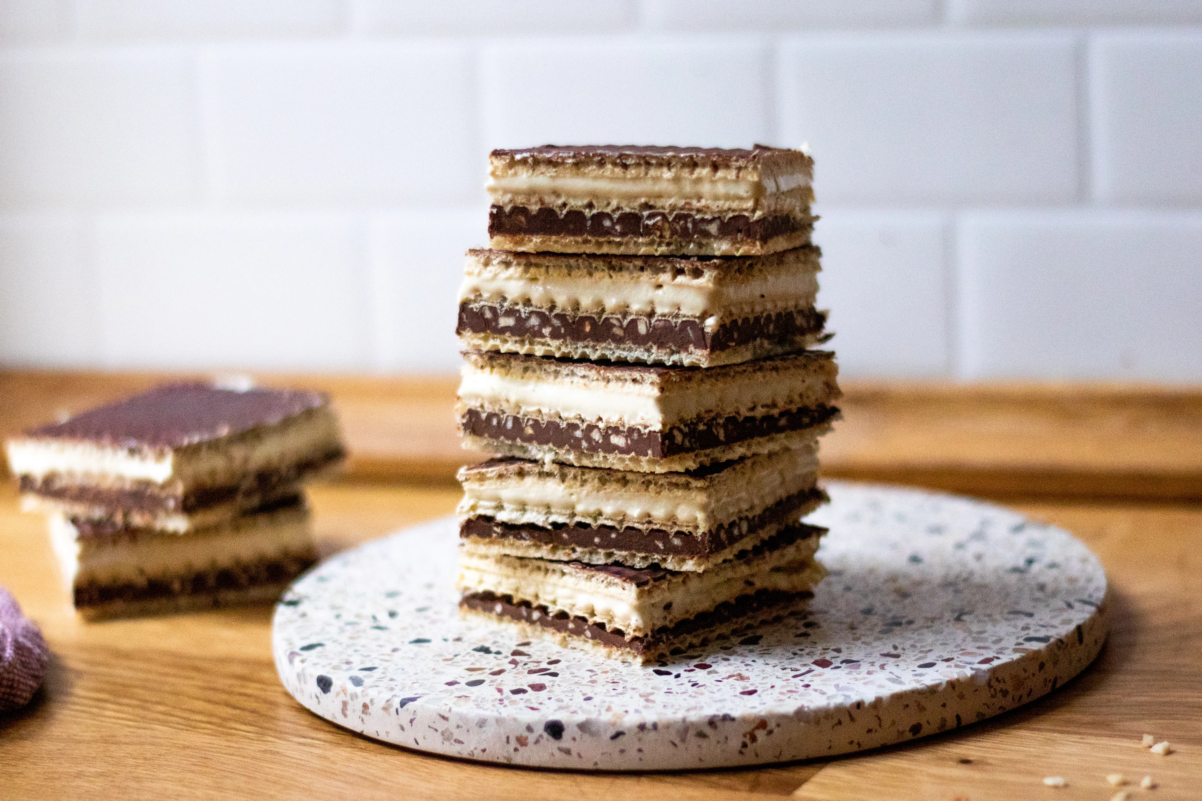 For serving, cut the vegan knoppers into wafer bars (6x6 cm / 2.5x2.5 inches).